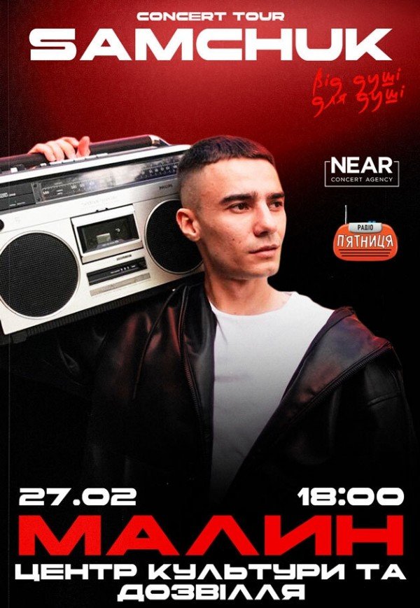 Samchuk відбудеться 27 лютого 2026, 18:00, п’ятниця в Центр культури та дозвілля. За допомогою сервісу internet-bilet.ua, Ви зможете з легкістю забронювати, замовити та купити квитки на концерт, спектакль, оперу, балет, майстер-класи, спортивні та дитячі заходи, що Вас цікавлять, оплативши їх найбільш зручним для Вас способом: через інтернет банківською карткою VISA/MasterCard, готівкою або кур'єром, якщо зробите замовлення квитка з доставкою.